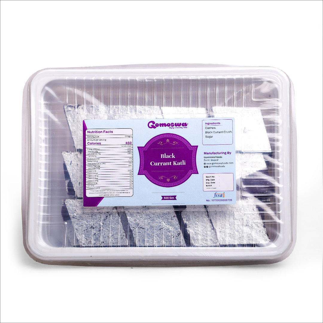 Our Black Currant Katli, a vibrant variation of the popular Kaju Katli, offers a unique blend of tradition and delectable decadence. The finest cashews, pure sugar, and actual black currant fruit are used to make this mithai. Every bite delivers a burst of tangy sweetness and a melt-in-your-mouth texture. The natural acidity of black currants and the rich, nutty base of cashews combine to produce a flavor profile that is both classic and delightfully modern. Its deep purple color and fruity aroma make it both aesthetically pleasing and enticing.